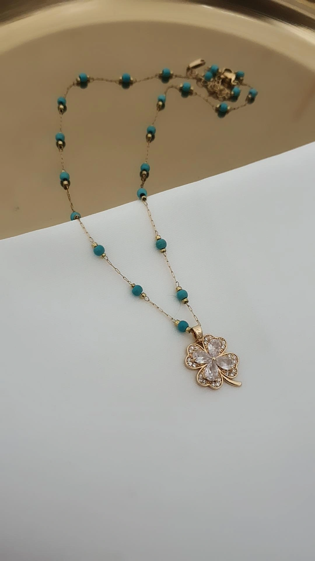 Çelik mavi boncuklu tasli Yonca uçlu kolye