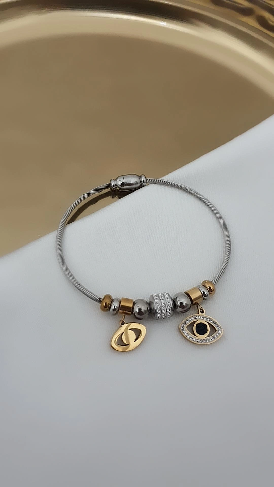 Çelik mıknatıslı takma yeri olan iki renkli göz sallantili bileklik